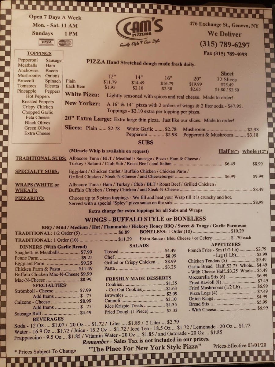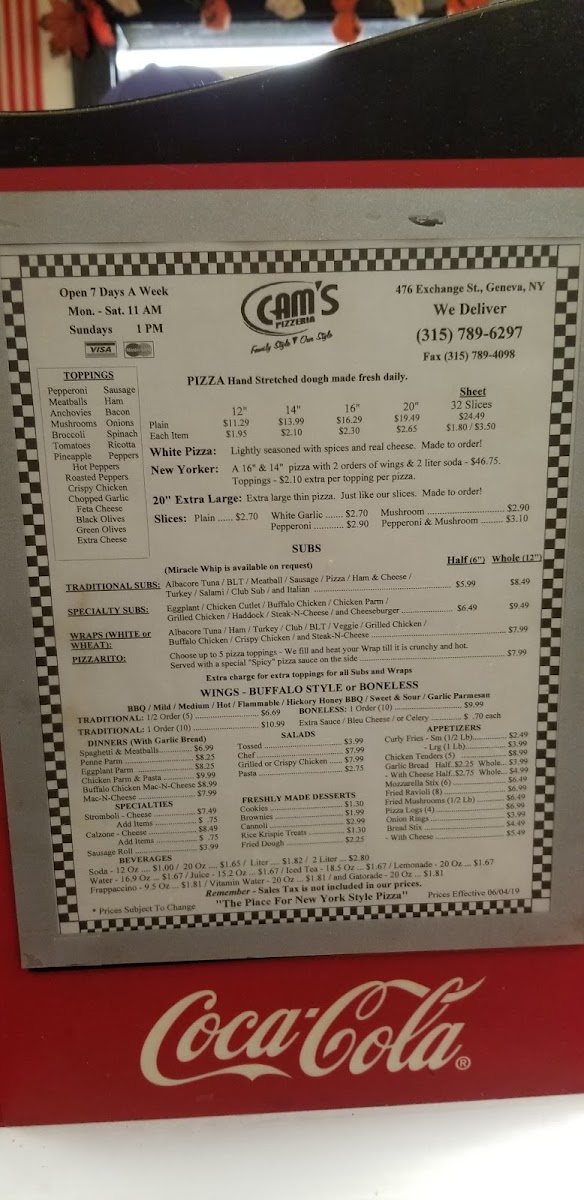 Welcome to Cam's Pizzeria, where the heart of New York pizza beats in Geneva, NY. Located at 476 Exchange St, this local gem is renowned for its mouthwatering thin crust pizza and delectable chicken wings. Customers rave about the gigantic slices and generous portions that leave you satisfied without breaking the bank.